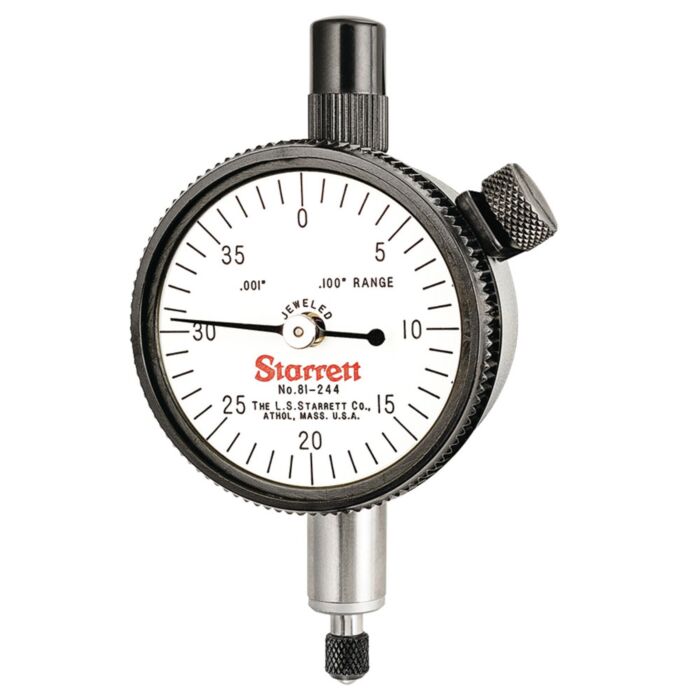 The Starrett 81 Series Dial Indicator has a shockless, hardened steel gear train and jewel bearings. It is furnished with a lug-on-center back. Antimagnetic and special non-shock mechanisms are options available for all models. .100" Range, Dial Reading 0-40, .001" Grad.