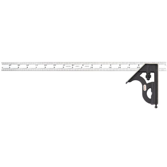 The Starrett 18" Combination Square with Square Head features a reversible lock bolt, scriber, spirit level, and hardened steel, photo-engraved blade with regular This product also includes a cast iron head with black wrinkle finish. 18", 4R Grad, Regular Blade finish.