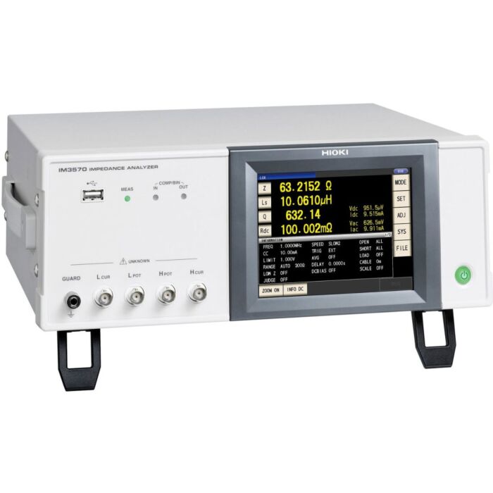 The Hioki IM3570 Impedance Analyzer, LCR meter and impedance analyzer is capable of measurement frequencies of 4 Hz to 5 MHz and test signal levels of 5 mV to 5 V combined into one measuring instrument. Advanced capabilities include LCR measurement with AC signals, resistance measurement with direct current (DCR), and sweep measurement which continuously changes the measurement frequency and measurement level.