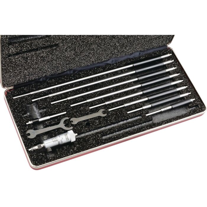 The Starrett 124 Solid -Rod Inside Micrometer Sets are the most popular inside micrometers because of their lightness, ease of use, and range. They are very useful for measuring inside diameters of cylinders and rings and measuring parallel surfaces. The desired range is obtained by assembling rods and spacing collars to the micrometer head. Measuring rods are provided with a shoulder that is set accurately in the micrometer head and locked in position. When assembling rods to the A and B heads, the reading line on the micrometer head should be lined up with the marking on each rod (except for the 50-75mm (2-3") rods). Rod diameters are approximately 6mm (1/4") on the A and B sizes, and approximately 8.5mm (11/32") on the C size. Each rod has individual length adjustment for the anvil by means of special wrenches furnished. 2-12" Range, .001" Grad, 10 Measuring Rods with Case.
