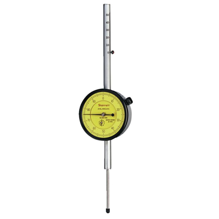 The Starrett 25, 655, 656 Series Dial Indicator with Long Range has a shockless, hardened steel gear train and are furnished with jewel bearings and lug-on-center backs. Conforms to AGD specifications except for range. Stem cap supplied as standard. Furnished with continuous reading double dial with direct reading count hands. 4.000" Range, Dial Reading 0-100, .001" Grad.